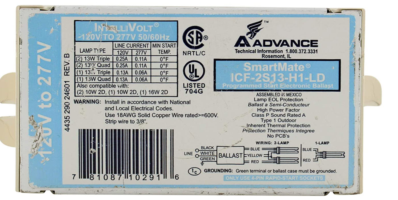ADVANCE ICF2S13-H1LD USE KIT VERSION BRAND NAME SMARTMATE BALLAST TYPE ELECTRONIC STARTINQ METHOD PROGRAMMED START LAMP CONNECTION SERIES INPUT VOLTAQE 120-277 INPUT FREQUENCY 50/60 HZ STATUS ACTIVE
